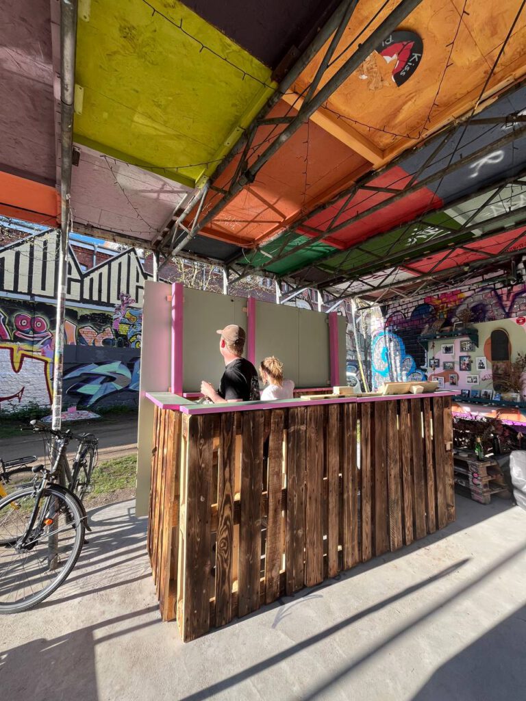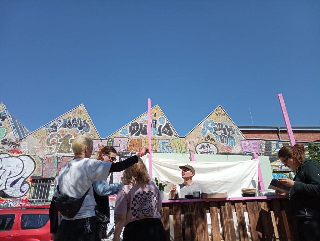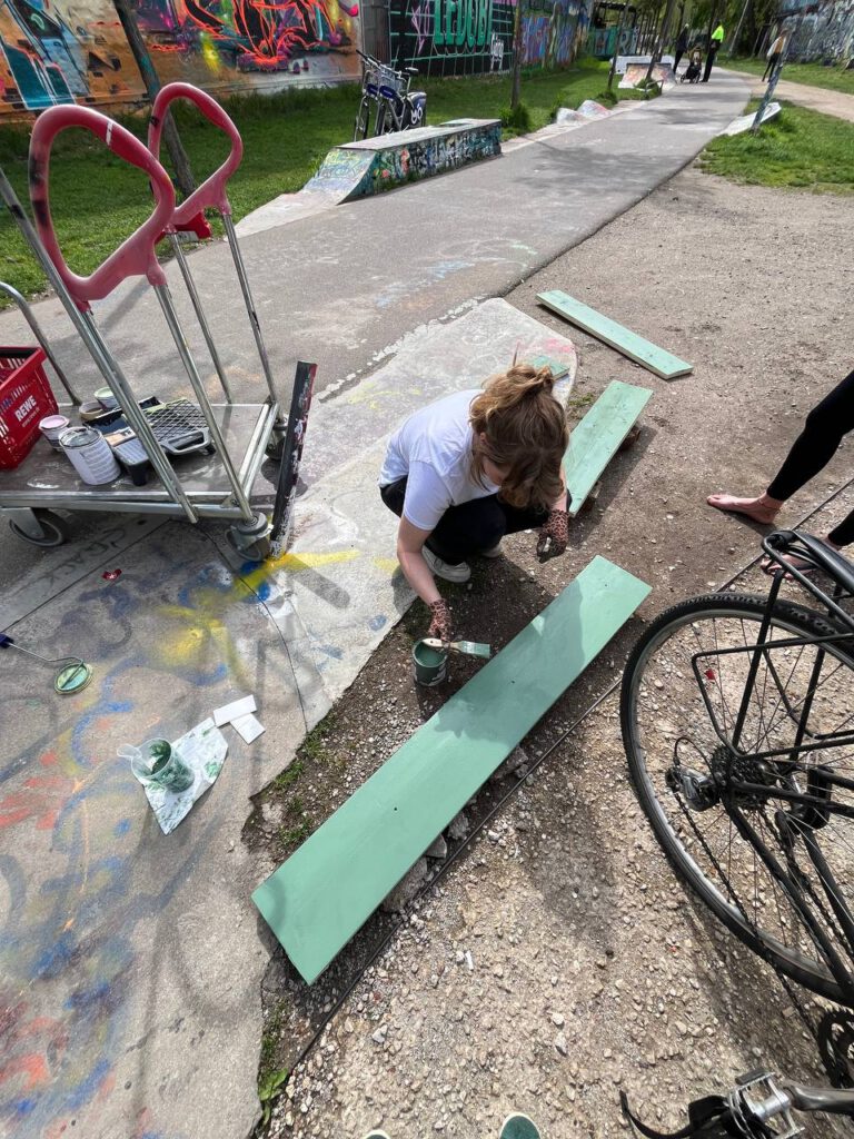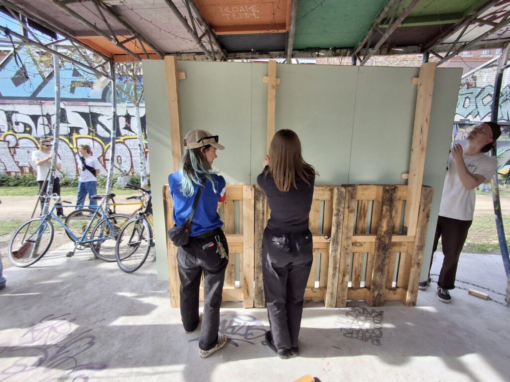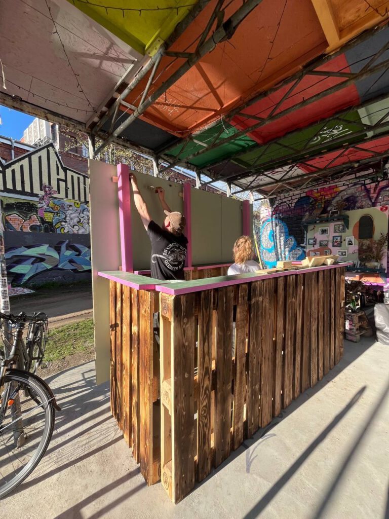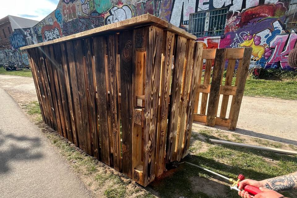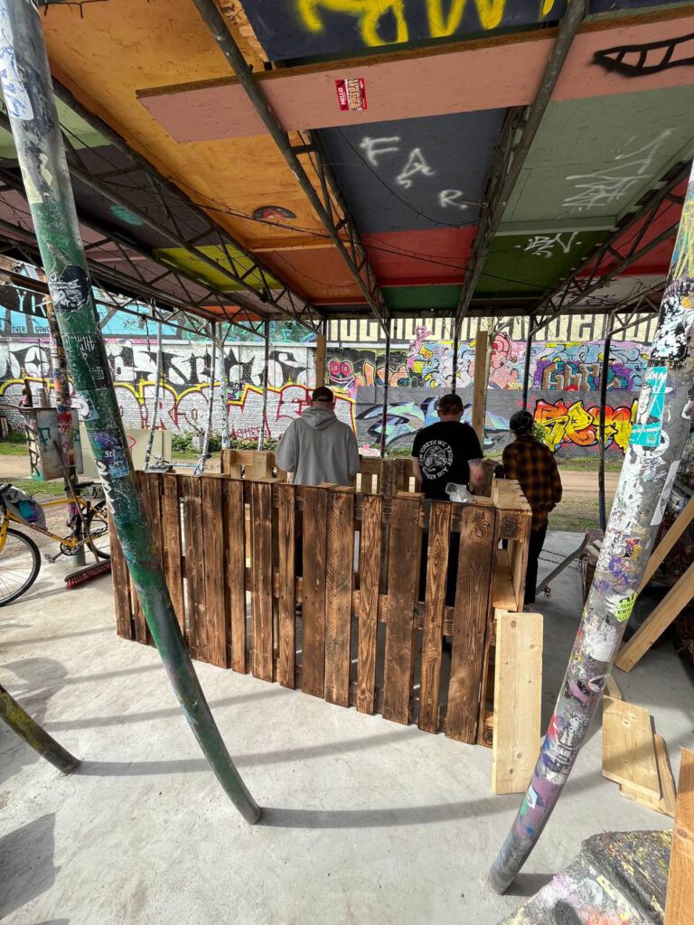 Aus alten Paletten wurde ein multimodularer Stand konstruiert und gebaut, der je nach Veranstaltung in verschiedenen Größen auf- und wieder abgebaut werden kann. Der Stand wird bei verschiedenen Veranstaltungen, wie Stadtteilfesten, eingesetzt und steht ebenso zur Ausleihe zur Verfügung.